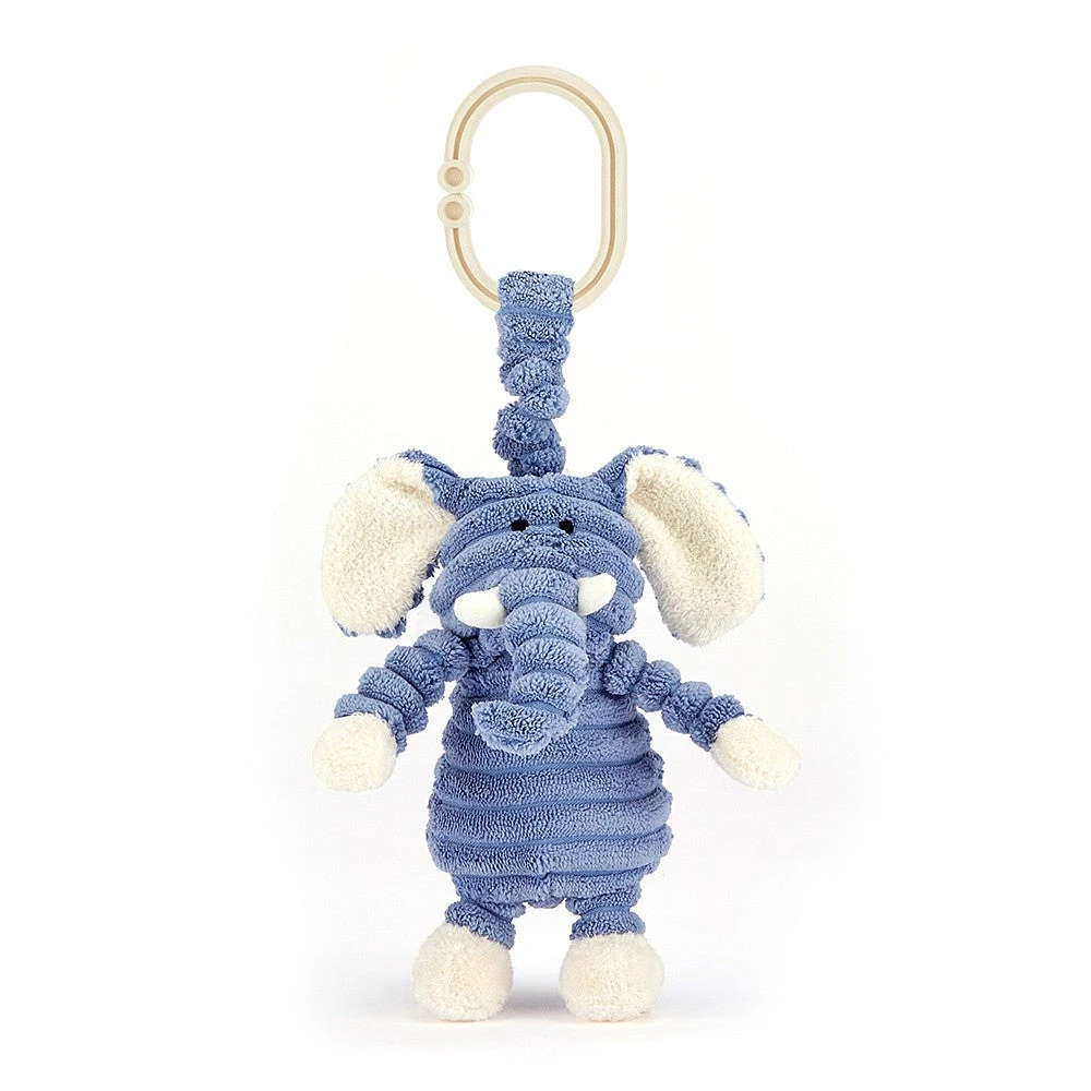 Jellycat Cordy Roy baby elephant jitter is een babyspeeltje met beweging. Wanneer je aan het koord trekt gaat de olifant trillen en schudden. De oren en pootjes van de olifant zorgen voor extra houvast voor je baby. Met de ring bevestig je het babyspeeltje aan de maxi-cosi, babygym of wandelwagen.